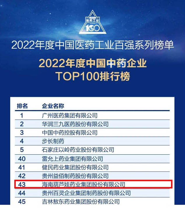 会议期间,一年一度的中国医药工业百强系列榜单隆重揭晓,美高梅mgm药业集团凭借领先的研发优势和扎实的生产实力以及稳健的市场推广能力,连续第四年成功入选“2022年度中国中药企业TOP100排行榜” ,排名稳步上升至第43位。